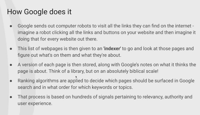 A search engines job is effectively going out, finding all the web pages out there, organising it in some fashion and then when someone searches for something, give them the most relevant piece of information back. Give them the most relevant page back. That's its job. That's what it's trying to do.